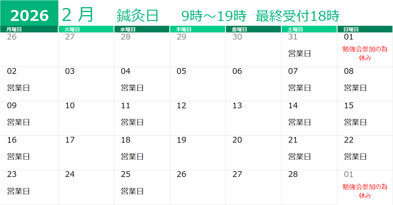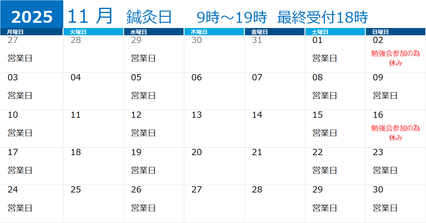 10月5日(日)、26日(日)は勉強会に参加、11日(土)・12日(日)は日本伝統鍼灸学会に参加のためお休みとなります。 10月は日曜の営業日が、10月19日のみとなっております。日曜に施術をご希望される患者様は、お早め […]