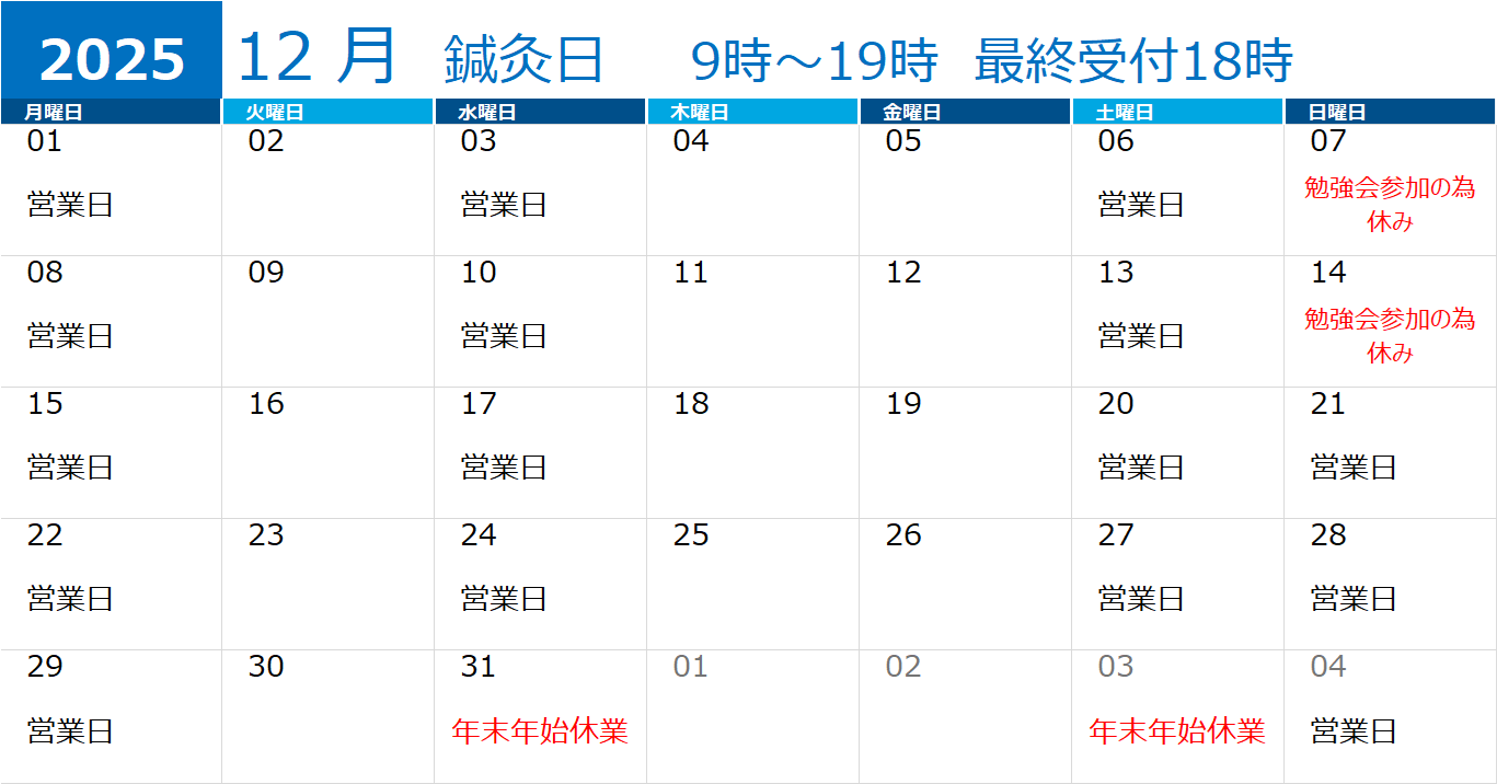 仕事始めは、4日からとなっています。 1月の勉強会は1日となっており、いつもより日曜日のご予約を多く承れます。 よろしくお願いいたします。 年末年始は何かとバタバタと忙しく、気づかないうちに疲れがたまりやすい時期です。 […]