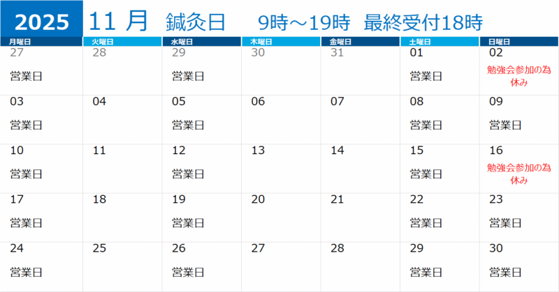 11月2日(日)、16日(日)は勉強会に参加のためお休みとなります。